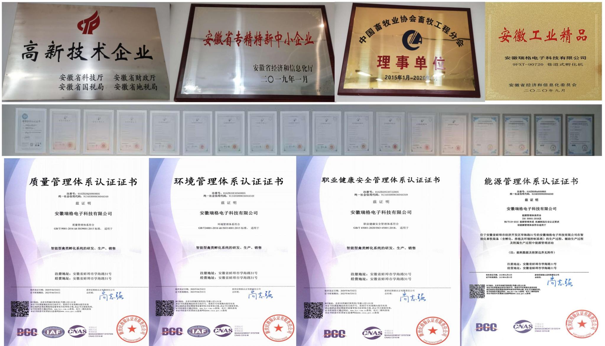 2020年被评为安徽省工业精品企业,2021年注册马德里国际商标,产品入选2023年安徽省工业领域节能环保“五个一百”推介目录,公司连续三次获得安徽省高新技术企业称号,是中国畜牧业协会畜牧工程分会理事单位”、中国畜牧业协议鹅业工作委员会常务副主席单位,先后荣获安徽省专精特新中小企业、安徽省工业精品企业、安徽省科技型中小型企业,蚌埠市企业技术中心、蚌埠市工业设计中心、蚌埠市战略性新兴企业、蚌埠市信息化与工业化融合示范企业、蚌埠市绿色工厂、蚌埠市健康企业、蚌埠市和谐劳动关系企业、蚌埠市首届质量品牌大赛三等奖、蚌埠市第十三批“3221”产业创新团队等荣誉资质。