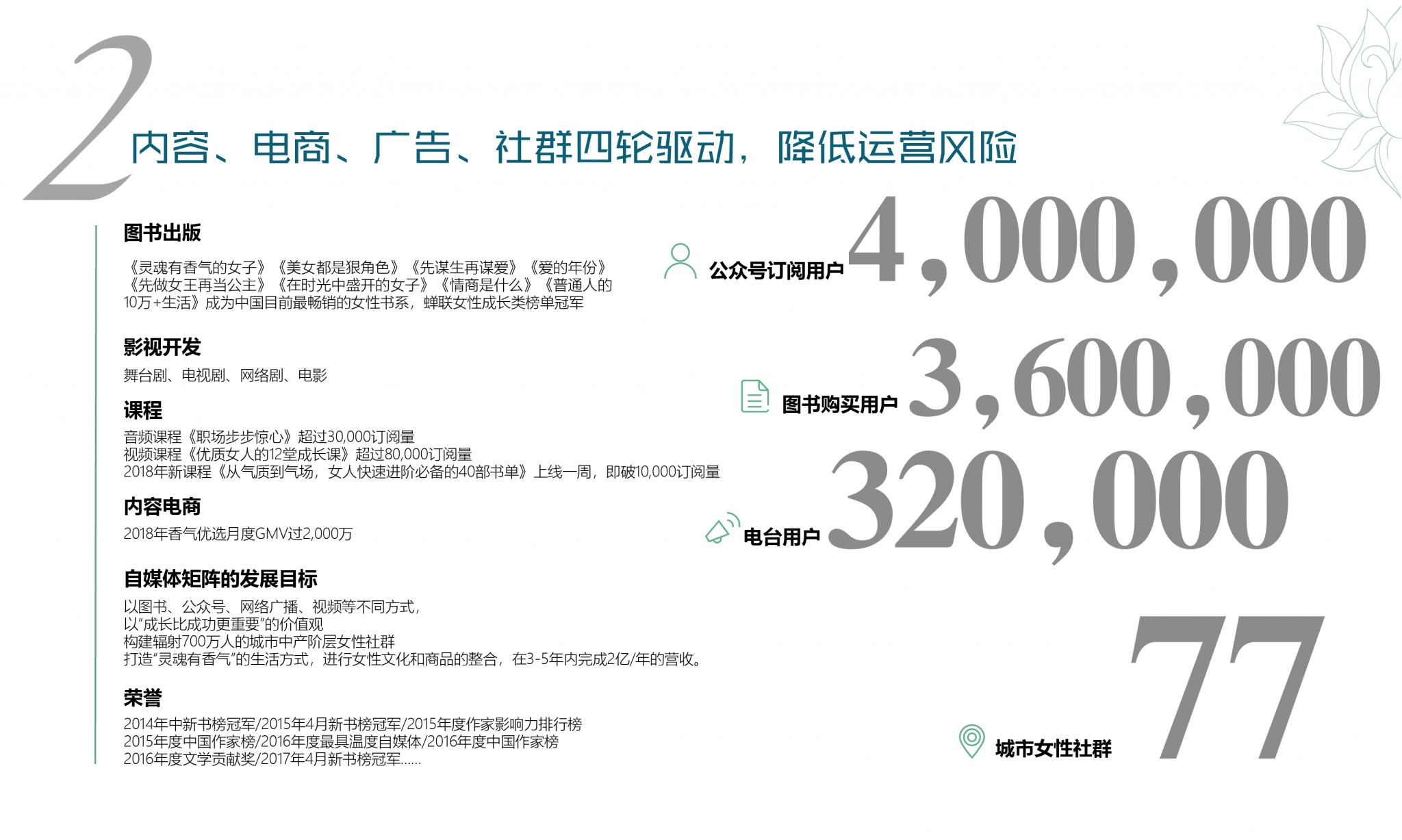 从2015年创办至今,在图书、自媒体、电商、知识付费、短视频、访谈节目等领域都有不同形式作品,拥有女性用户超过2000万+。