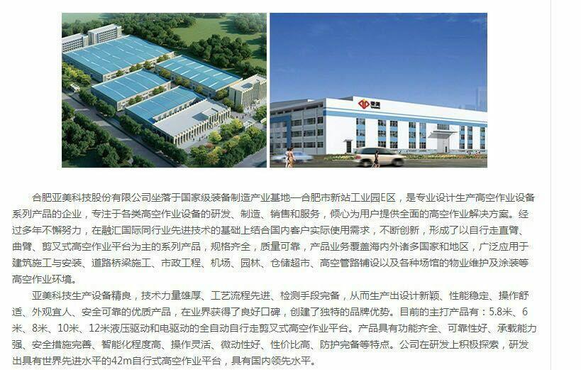 合肥亚美科技股份有限公司坐落于国家级装备制造产业基地——合肥新站工业园,是一家专注于各类高空作业设备的研发、制造、销售及服务为一体的科技生产型企业。目前主要产品有全自动自行走剪叉式高空作业平台,主要型号有5.8米、6米、8米、10米、12米宽版及窄版,驱动方式:液压驱动和电驱动,品种规格丰富,广泛应用与工程建设、建筑、造船、市政工程、电力、通讯、园林、场馆、机场、工矿、工业安装、设备维修、主体仓库、高空管路铺设、各种场馆的物业维护及涂装等高空作业环境。迄今为止,产品已遍布大江南北,同时远销东南亚、欧美等海外市场。