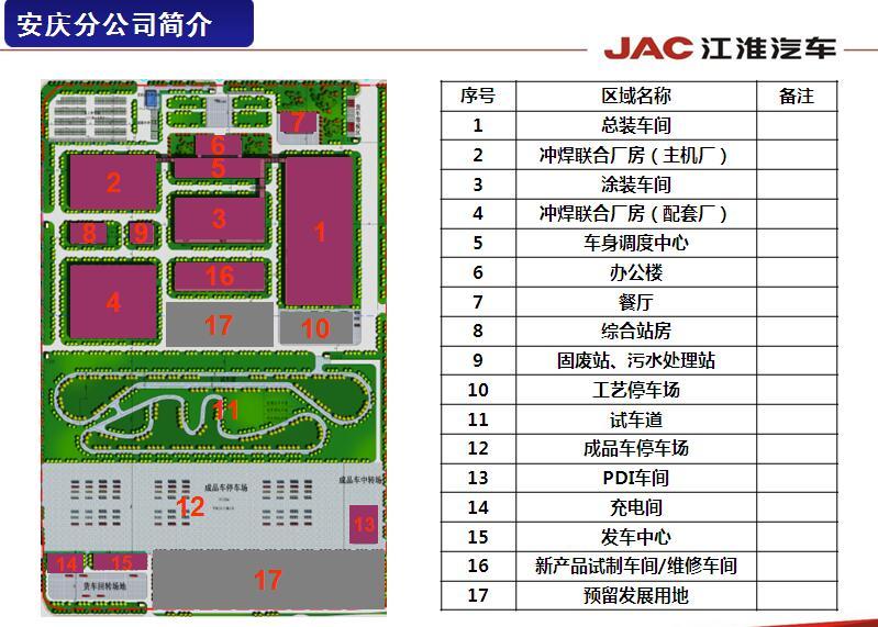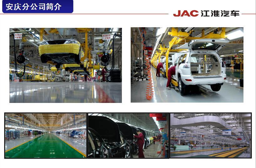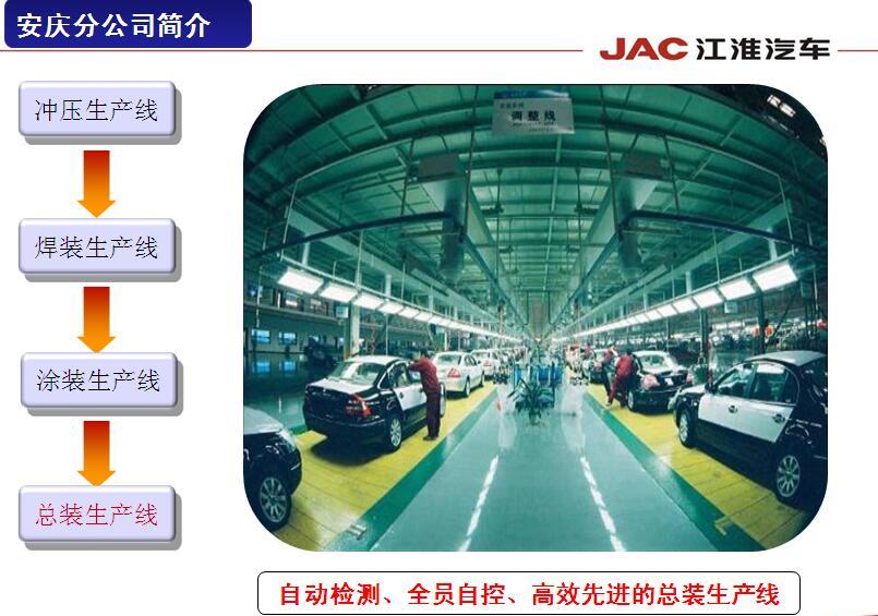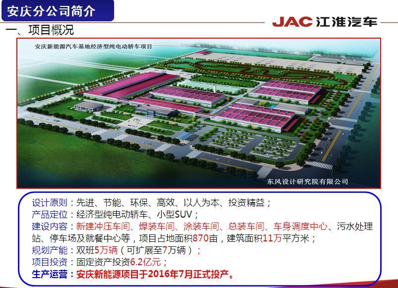 安徽江淮汽车集团股份有限公司安庆分公司成立于2015年12月份,坐落于安庆市经济技术开发区,占地面积达870余亩,项目投资为15亿元,2016年投产的一期年产5万台(现已具备8万台能力)整车的汽车工厂是国内首个专业化新能源汽车生产基地,建成了包括冲压、焊装、涂装以及总装等汽车四大工艺生产线。