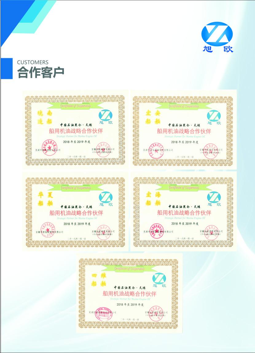 旭欧公司知名客户。工业油方面:美的集团旗下威灵(芜湖)电机制造有限公司、安徽美芝制冷设备有限公司(合肥美芝)、安徽美芝精密制造有限公司(芜湖美芝)、芜湖美的精品厨卫电器有限公司、广东威灵电机制造有限公司;玉柴联合动力股份有限公司等。车用油方面:芜湖新平安物流车队、芜湖市公交集团第二分公司等。船用油方面:芜湖市皖南造船有限公司、芜湖市宏海船舶修造有限公司、安徽华夏船舶修造有限公司、芜湖四维船舶技术有限公司、安徽皖能电器设备有限公司无为县金牛湾水上加油站、马鞍山当涂顺华水上加油站等。