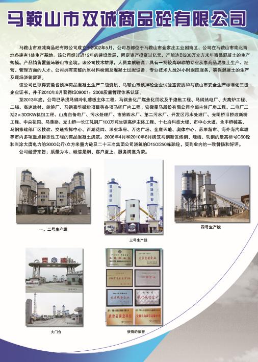 马鞍山市双诚商品砼有限公司成立于2002年5月,公司总部位于马鞍山市慈湖高新区,公司在马鞍山市南北两地各建有1处生产基地。该公司经过近十多年的建设发展,固定资产投资过亿元,产能达到200万立方米年商品混凝土的生产规模。产品销售覆盖马鞍山市全境。该公司技术雄厚,人员素质较高,具有一批较高职称的专业从事商品混凝土生产、经营、管理方面的人才。公司拥有完整的原材料检测及混凝土试配设备,专业技术人员24小时跟踪服务,确保混凝土的生产及现场浇筑需要。