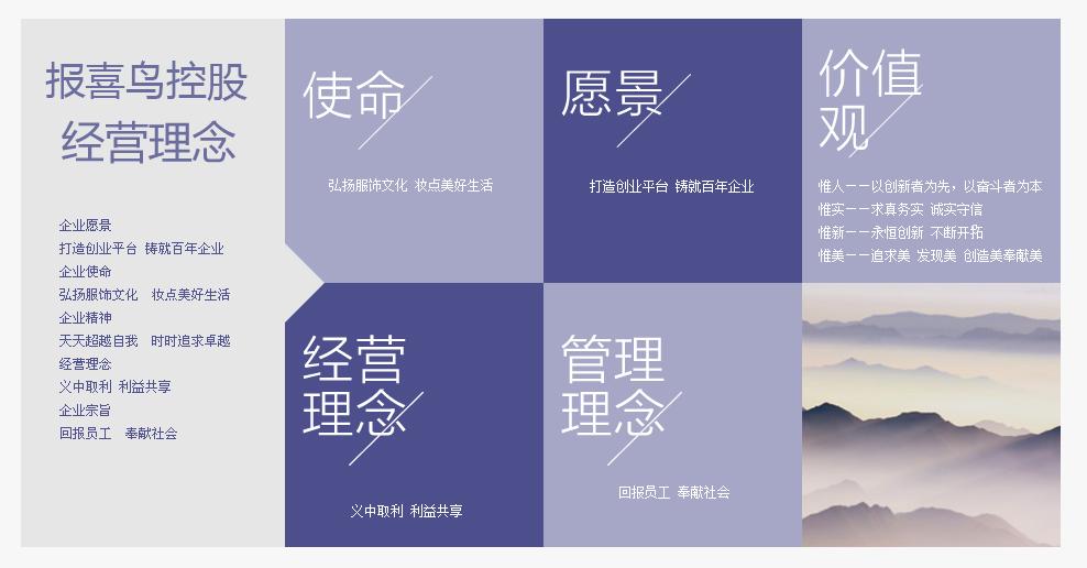 报喜鸟集团组建于1996年,是国内著名的大型服饰企业集团之一,现有员工10000余人,总产值逾10亿,年产值超50亿,连续18年进入全国服装行业销售收入、利税双百强之列,西服市场综合占有率已进入全国前三名,成为中国高档服饰的先锋品牌企业和国内最大规模的高档服饰供应商之一。