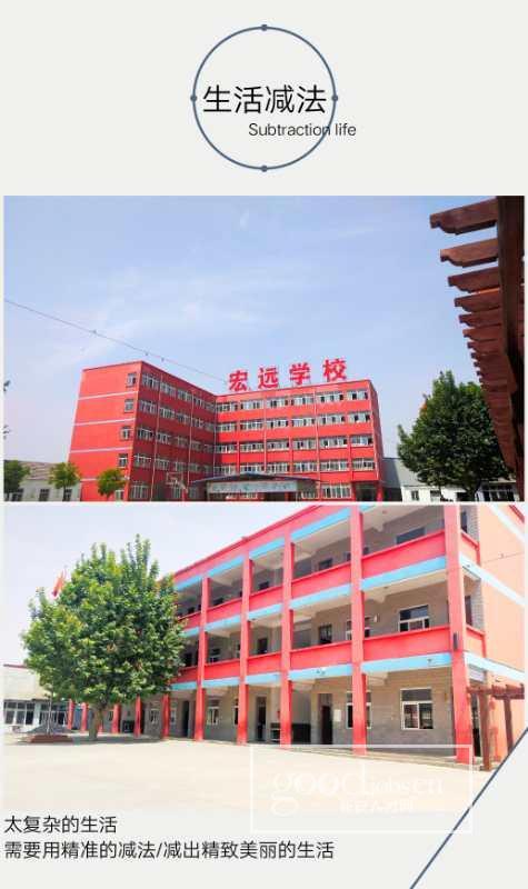 宏远小学是一家民办寄宿制小学。学校不大,但是人情味满满,采用的是人性化在前制度化在后的管理模式。全校实行家文化理念,老板是一个有教育情怀的人,做学校坚决不是做生意,虽然目前学校还没有什么名气,但是我们励志要把学校打造成一个有温度、能服务、社会型小学,不管是刚毕业的小白还是有经验的职场老人,都适合来校工作。宏远小学是一个处于发展中的学校,管理层平均年龄33岁,非常容易沟通,工作起来不会有任何职场上的问题。如果你打算在教育的路上一直走下去,完全可以信任宏远。宏远小学欢迎您的到来。