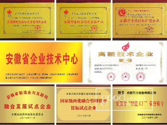 万力轮胎经过三十年的发展,现拥有“万力”“万里星”“SONNY”三大主力自主品牌。公司已通过IATF16949和ISO9001质量管理体系、测量管理体系、两化融合管理体系等诸多体系认证,以及CCC(中国)、DOT(美国)、ECE(欧盟)、GCC(海湾)、INMETRO(巴西)等主要产品认证,并与江淮汽车、广汽日野、南京金龙、株洲中车、庞巴迪等知名企业进行了配套。公司拥有国内外自主专利70余项,先后获得 “安徽省智能工厂”“安徽省制造业与互联网融合发展试点企业”“国家工信部两化融合贯标试点企业”“合肥市创新型企业”“合肥市企业技术中心”“安全生产标准化二级企业 ”等荣誉称号。