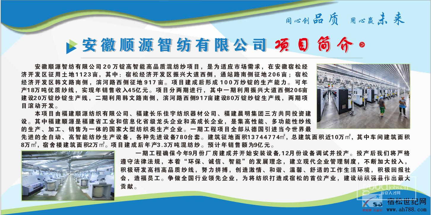 安徽顺源智纺有限公司在安徽省安庆市宿松县经济开发区征用土地1200亩,投资45亿元,形成100万纱锭的生产能力,可年产18万吨优质纱线,实现年销售收入45亿元。