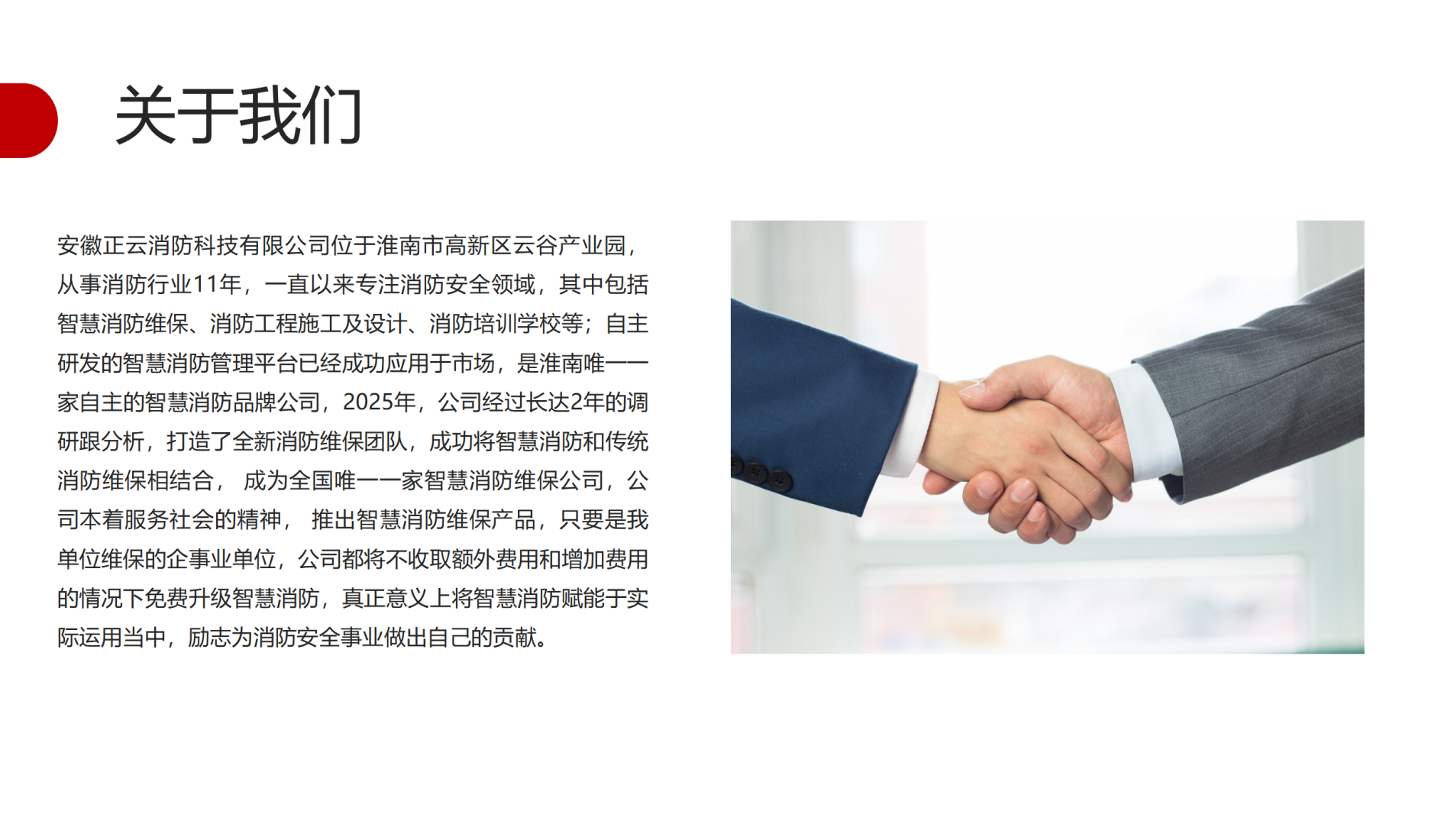 安徽正云建设集团有限公司成立于 2015 年 1 月 12 日,位于安徽省淮南市毛集实验区 ,注册资本为伍仟万元整;是一家退役军人创业企业,自成立以来旗下孵化子公司共三家,分别是安徽正云建设集团有限公司、安徽正云消防科技有限公司、淮南市云天消防培训学校。公司拥有一支高素质、专业化的团队,目前员工总数达到 100 余 名,其中包含一级注册消防工程师5名、一级机电工程建造师5名、一级建筑工程建造师5名、二级建筑工程建造师8名、二级市政公用工程建造师5名、二级安装工程造价师5名、二级土建工程造价师1名,高、中级工程师15名、各类技术管理人员30余名。公司实行董事会领导下的总经理负责制,下设市场部、正云消防-维保部、正云消防-工程部、云天培训、财务部、商务部、综合部等部门。